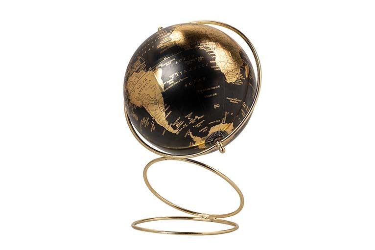 Elegante mappamondo decorativo in metallo e plastica nero/oro. Perfetto per arredare casa e ufficio. Dimensioni 15x15x23cm. Stile moderno e raffinato.
