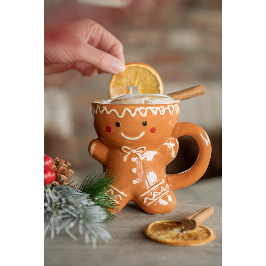 Bellissima tazza marrone a forma di uomo di pan di zenzero. Realizzata in ceramica. Perfetta per le bevande calde durante i mesi invernali e aggiunge un tocco festivo a ogni casa. Un'idea regalo deliziosa.