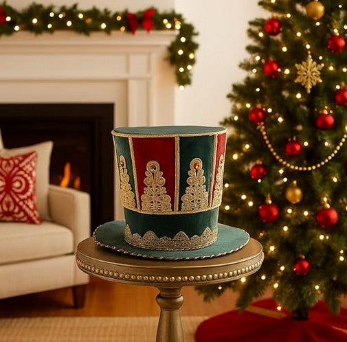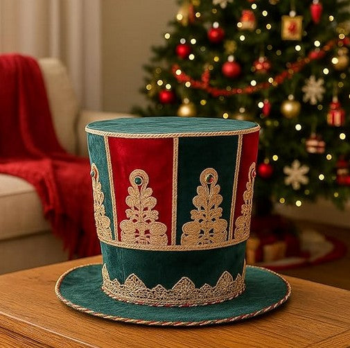 Questo cappello decorativo natalizio da 22 cm è un vero gioiello per chi desidera aggiungere un elemento scenografico, raffinato e originale alle proprie decorazioni. Realizzato in tessuto effetto velluto nei toni caldi del bordeaux e del verde scuro, è impreziosito da ricami dorati finemente lavorati e da dettagli gioiello che donano brillantezza senza eccessi.