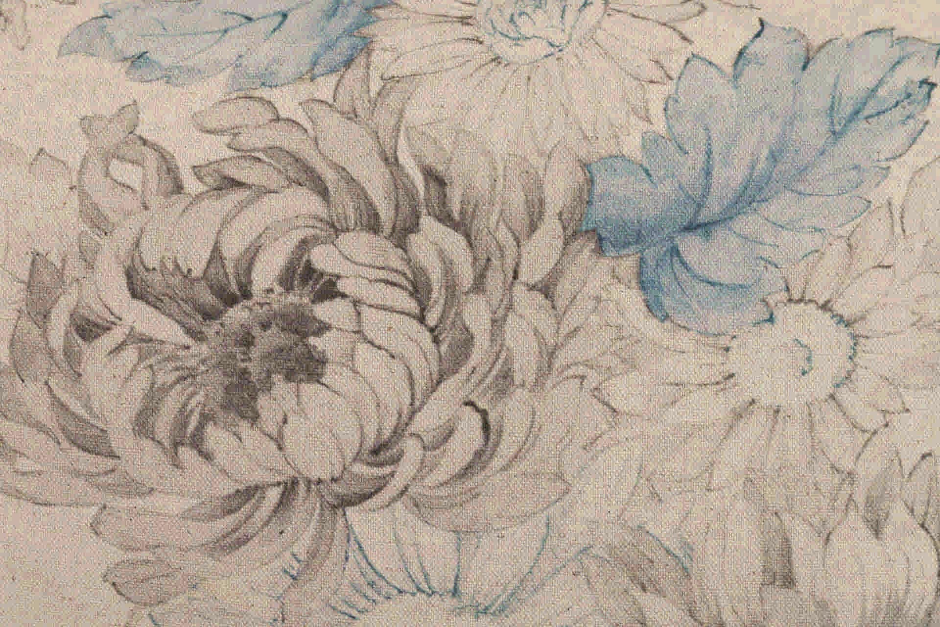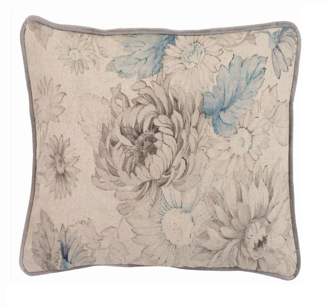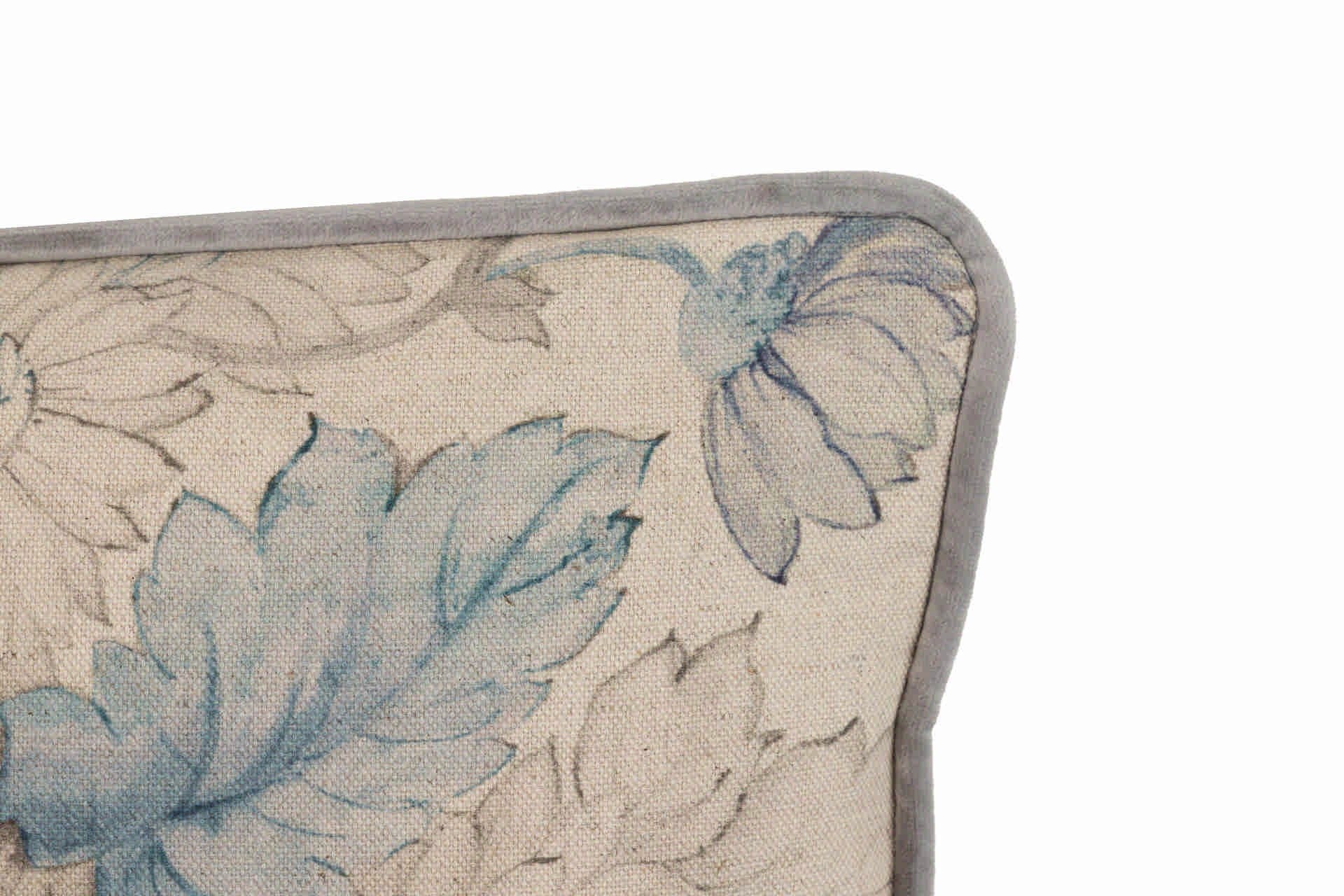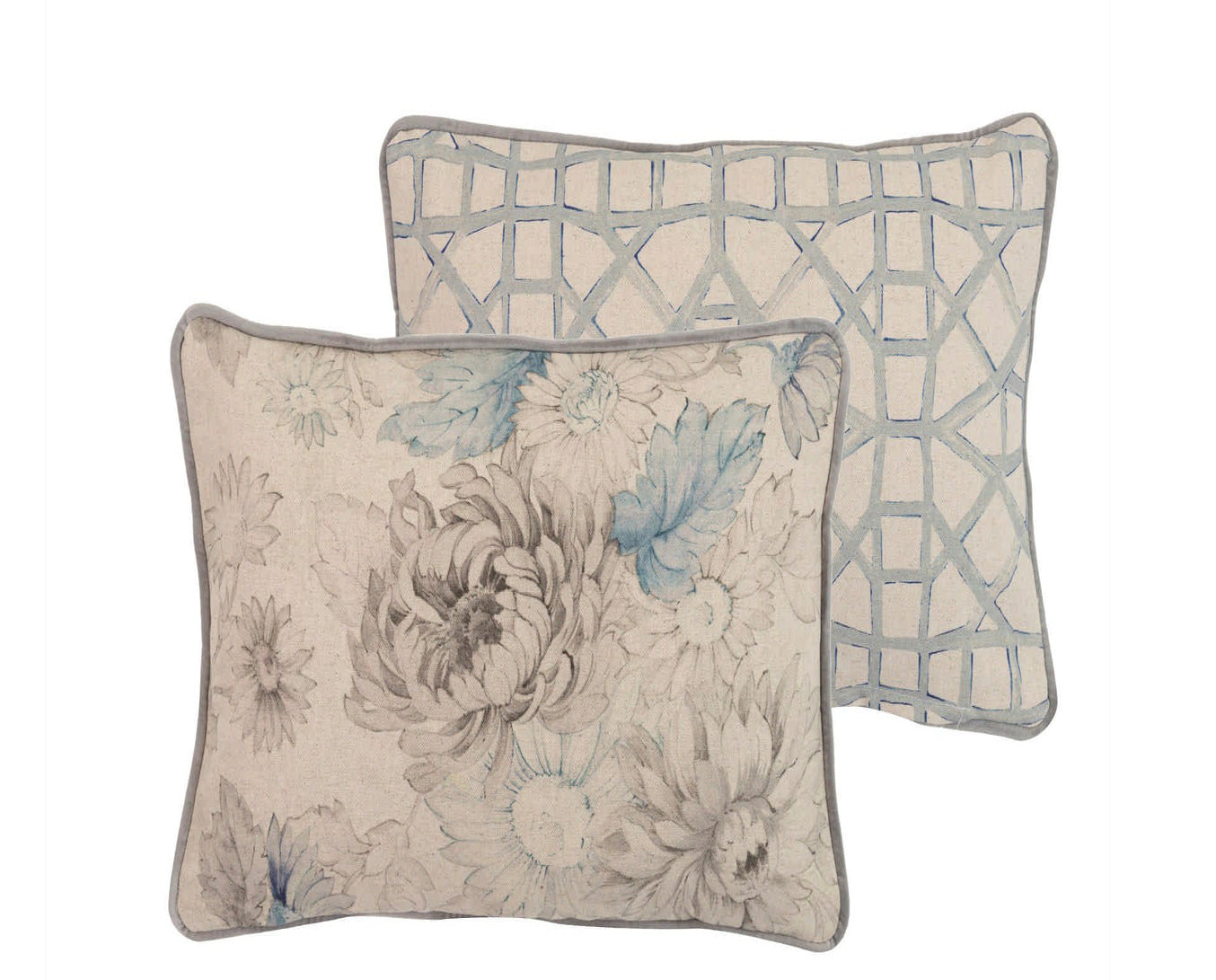 Cuscino decorativo Flower Mosaic in canapone azzurro/grigio 43x45cm. Design floreale a mosaico elegante per arredare casa. GARPE tessile di qualità.